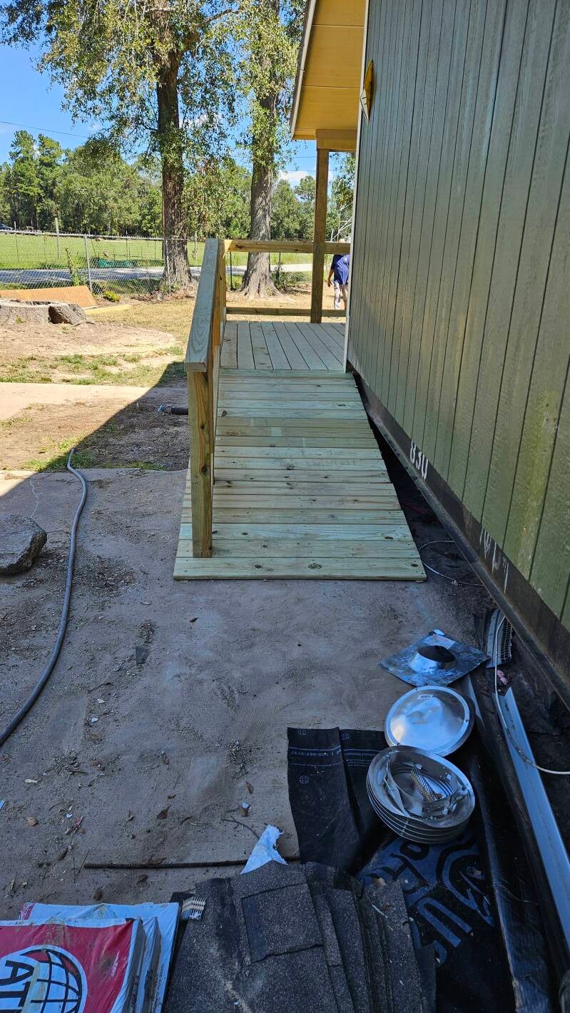 Here we have a beautiful 80ft×12ft deck that we had the honor of building . We added hand rails all around along with hardie soffit on the top along with stairs and a ramp